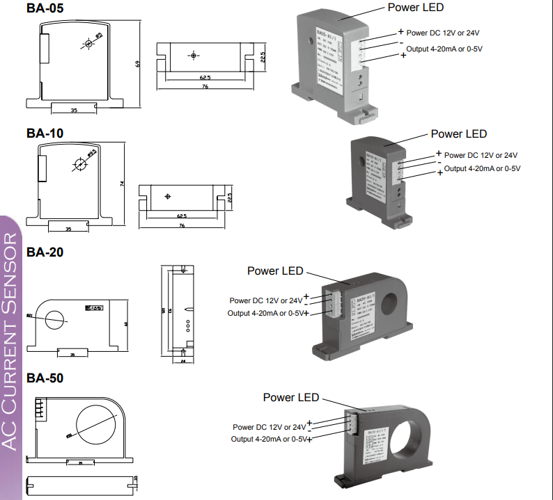 خروجی سنسور جریان : قابل سفارش با خروجی های جریانی 20-4 میلی امپر و 20-0 میلی آمپر و همچنین خروجی های ولتاژی 10-0 ولت ، 5-0 ولت ، 5-1 ولت
